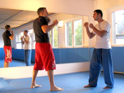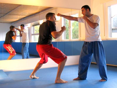 befindet sich ausserhalb der Schlag- und Trittdistanz