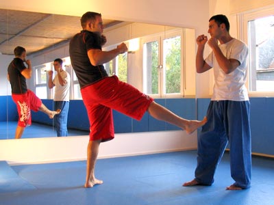einem Frontkick hält er ihn weiterhin auf Distanz. |