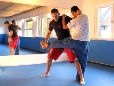 nehmt dem Angriff die Wucht indem er mit dem Tritt