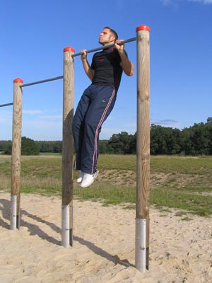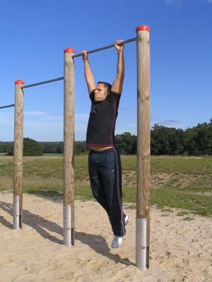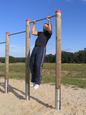 Man greift die Klimmzugstange etwas weiter als Schulterbreite,