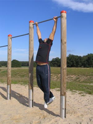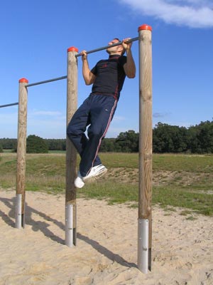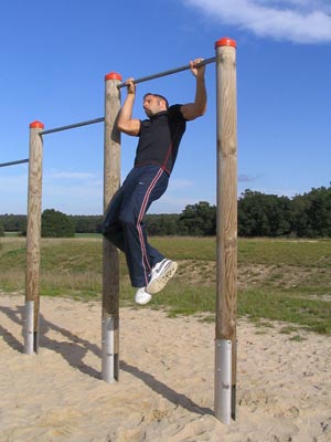 Man greift die Klimmzugstange etwas weiter als Schulterbreite,